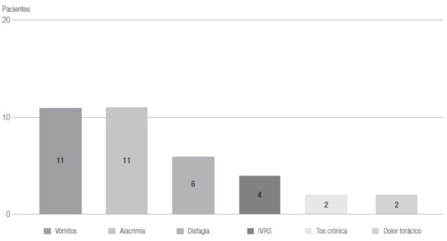 Los síntomas más comunes fueron vómitos postprandiales y alacrimia, se presentaron en el 100% de los casos al momento del diagnóstico; el síntoma inicial fue el vómito, observándose desde los primeros días de vida en casi todos los pacientes (90%). La alacrimia estuvo presente desde los primeros meses de la vida en solo 2 pacientes (18%).