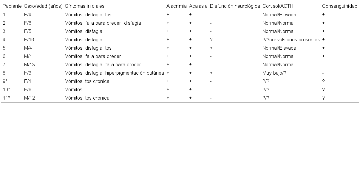 Resultados. La edad promedio al momento del diagnóstico fue de 5,9 años (rango 1-16 años). Hubo predominio del sexo femenino (n = 7). Los síntomas más comunes fueron vómitos postprandriales y alacrimia, presentes en el 100% de los casos al momento del diagnóstico. La insuficiencia suprarrenal no fue común, solamente se documentó en un paciente. Hubo consanguinidad entre los padres en el 62.5% de los casos.