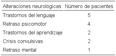 Se presentaron alteraciones neurológicas en 6 pacientes (54%) (Tabla 2).
