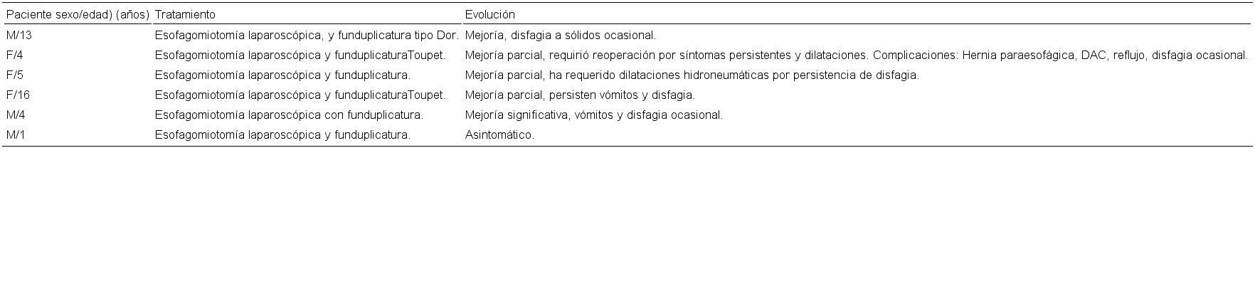Cinco pacientes se perdieron, en los cinco el seguimiento fue de 1-3 años, y otro paciente se siguió por 16 años hasta la edad adulta. Los seis pacientes fueron sometidos a cirugía laparoscópica y se les realizó esofagomiotomía de Heller más funduplicatura. Hubo buena respuesta al tratamiento quirúrgico en los cinco pacientes, instalándose gradualmente una alimentación normal, y con ganancia de peso en todos. Un paciente persistió con disfagia importante y se operó nuevamente, ampliándose la esofagomiotomía con lo cual hubo mejoría, sin embargo, presentó síntomas de enfermedad por reflujo gastroesofágico (ERGE) y tuvo varias reintervenciones por complicaciones post-quirúrgicas (bridas, ERGE, hernia hiatal-paraesofágica). Cabe mencionar que todos los pacientes ocasionalmente presentaron disfagia sobre todo a carne, sin que esto fuese visto como un problema por el paciente o sus familiares. Todos ellos consideraron tener una evolución post-operatoria satisfactoria (Tabla 4).
