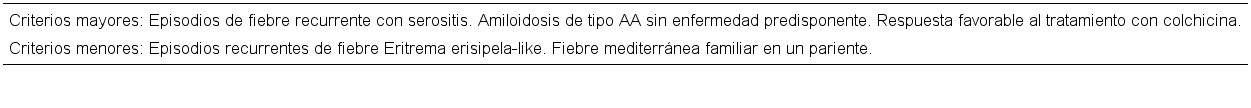 El diagnóstico se establece sobre la base de los criterios de Tel-Hashomer (véase la Tabla 1).19 Nuestro paciente reúne dos criterios mayores (episodios de fiebre recurrente con serositis y respuesta favorable al tratamiento con colchicina), por lo que la sospecha de FMF se confirma.