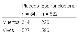 Tabla 1. Tabla de 2 x 2 que muestra la mortalidad en los pacientes con espironolactona vs. con un placebo