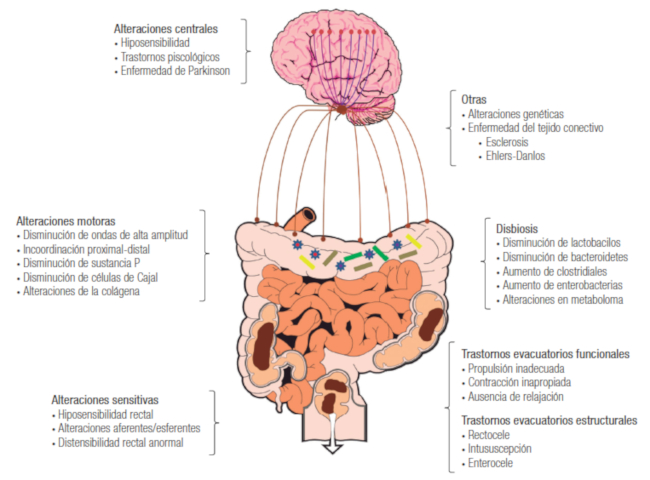 El EC debe considerarse como una enfermedad compleja y multifactorial. Es importante recordar que el acto de la defecación es complejo, y que involucra estructuras neuromusculares que deben coordinarse, además de que esta influenciado por el contenido de agua y el volumen de las heces, la ingesta calórica, la microbiota intestinal y los trastornos psicológicos y conductuales.1, 9 En la Figura 1 se ilustran los principales mecanismos fisiopatológicos asociados al EC.