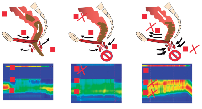 Nota: La figura A ilustra la sincronía o sinergia entre el aumento de la presión intrarrectal (#1) y la relajación de forma simultánea de la cintilla puborrectal (#2) y los esfinteres anales (interno [EAI] y externo [EAE] #3), facilitando así la expulsión de las heces. En la figura B, se muestra cómo la ausencia de un pujo adecuado (#1) no es capaz de generar un gradiente de presión suficiente para que la cintilla puborrectal y los esfínteres se relajen apropiadamente (#2 y #3), condicionando así un trastorno evacuatorio. La figura C ilustra cómo, a pesar de que existe un pujo adecuado (#1), la ausencia de relajación o la contracción inapropiada del puborrectal y los esfínteres (#2 y #3) impide la evacuación de las heces (defecación disinérgica).