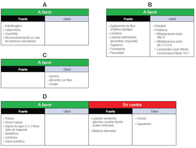 Nota: La calidad de la evidencia A se considera alta, la B moderada, la C baja y la D muy baja.