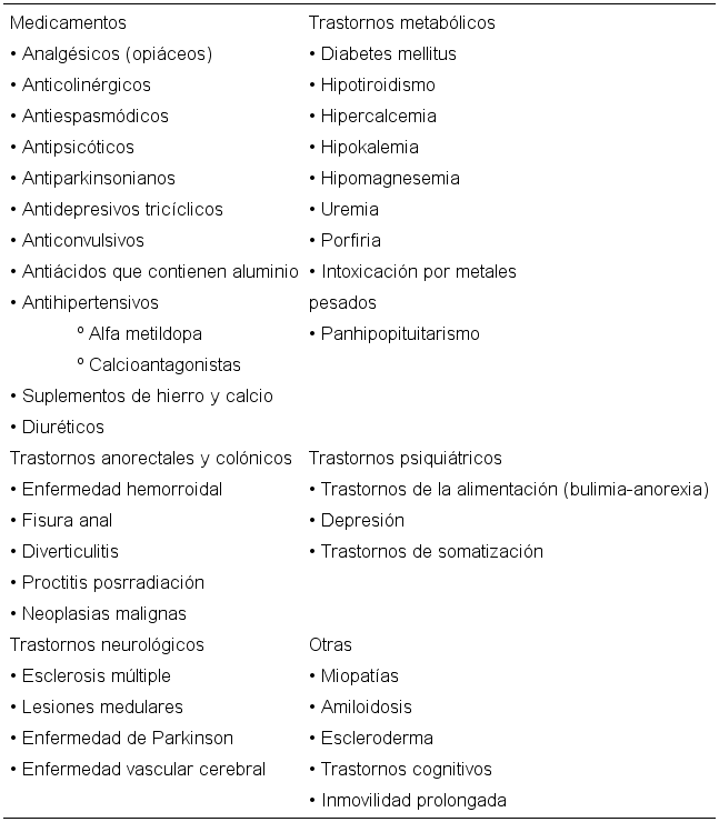 Según su tiempo de presentación el estreñimiento puede considerarse de inicio "agudo" cuando tiene una evolución menor a una semana y "crónico" cuando los síntomas persisten por más de cuatro semanas.1, 8, 9 De acuerdo con su origen el EC puede ser primario o secundario.1, 8 El estreñimiento "primario" es consecuencia de múltiples alteraciones fisiopatológicas (véase la siguiente sección), siendo las más importantes la alteración de la regulación colónica del movimiento de las heces, junto con la falta de coordinación del aparato neuromuscular anorrectal y la disfunción del eje cerebro-intestino.11 Mientras que el secundario es causado por múltiples causas, tales como fármacos (opioides, bloqueadores de los canales de calcio, AINEs), trastornos neurológicos (enfermedad de Parkinson), o enfermedades metabólicas (diabetes, hipotiroidismo) e incluso problemas anatómicos (enfermedades anorrectales y colónicas).