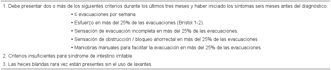 El estreñimiento se define como la defecación no satisfactoria (sensación de evacuación incompleta), resultante de evacuaciones poco frecuentes, o con dificultad de expulsión (sensación de obstrucción anorrectal y necesidad de maniobras manuales para facilitar la evacuación), o ambas.9 Sin embargo, este término también es utilizado para describir una variedad de síntomas, que incluyen heces duras, esfuerzo excesivo, distensión y dolor abdominal.10
