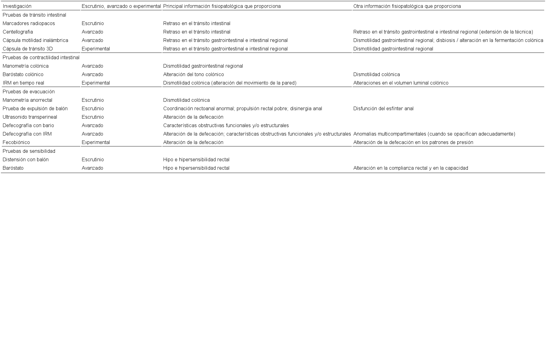 Ninguna prueba proporciona una descripción completa de la defecación, por lo que en general se emplea una combinación de estas (Tabla 3) para evaluar la estructura y la funciones motora y sensorial.53 Los estudios diagnósticos avanzados de la función del colon, recto y ano son recomendados en pacientes con EC y en quienes han fallado los tratamientos de primera línea como la optimización de la consistencia de las heces, el entrenamiento del hábito intestinal, el asesoramiento sobre el estilo de vida y el tratamiento farmacológico estándar.1, 54