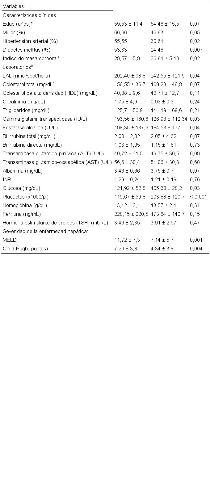 Los scores de severidad de la enfermedad hepática fueron: MELD (11,72 ± 7,3 vs. 7,14 ± 5,7; p = 0,001) y Child-Pugh (7,26 ± 3,8 vs. 4,34 ± 3,8; p = 0,004) fueron significativamente más altos en los pacientes con cirrosis criptogénica/NASH. La actividad de la LAL fue menor en forma significativa (202,40 ± 98,8 vs. 242,55 ± 121,9; p = 0,04) en el grupo de pacientes con cirrosis criptogénica/NASH.