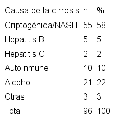 En los pacientes que tenían definida la etiología de la cirrosis, la causa más común fue el origen alcohólico (22%). En la Tabla 2 se muestran las causas de cirrosis en los pacientes del estudio.