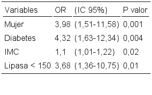 En el análisis multivariable, encontramos que las mujeres, los pacientes diabéticos, el IMC elevado y presentar niveles de LAL < 150 nmol/spot/hora, tienen una relación significativa con la cirrosis criptogénica/NASH (Tabla 3). Al evaluar la edad como variable de confusión, incluyéndola en el modelo, y al realizar la comparación basada en residuales, incluida o no en el modelo, no se encontró suficiente evidencia para demostrar que el modelo con la edad era mejor que sin ella; así mismo, el valor del beta de la variable actividad de la LAL no tuvo una diferencia superior al 10%, con lo cual, se concluyó que la edad no fue una variable confusora.