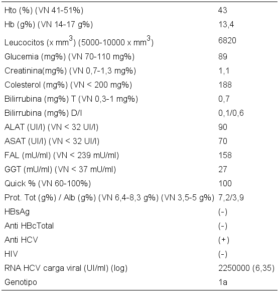 Varón de 41 años de edad, peso 67 Kg, talla 185 cm, IMC 19,5 Kg/m2, con diagnóstico de FQ realizado a los 9 años, presentando un compromiso pulmonar severo por infección crónica por Pseudomona Aeruginosa y Staphilococus Aureus meticilino resistente, asistido en la Unidad de Fibrosis Quística de adultos de HIGA R Rossi de la ciudad de La Plata, Argentina. Ante la evidencia de un progresivo deterioro de la función respiratoria (VEF1: 17%, CVF 35%), requirió internación en sala general. Los resultados de las pruebas bioquímicas y hematológicas realizadas durante la internación están detalladas en la Tabla 1. Se solicitó RNA HCV carga viral 2250000 UI/ml (log 6,35) y genotipo 1a.