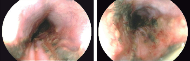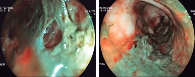 Cinco meses luego del TH presentó un episodio de hematemesis sin descompensación hemodinámica. Se realizó VEDA en la que se observó una luz esofágica de tamaño conservado pero con abundantes coágulos y restos de sangre en su interior, que fueron extraídos con éxito mostrando una mucosa subyacente con áreas de aspecto necrótico desde el tercio proximal en sentido distal hasta inmediatamente por encima de la UEG (Figura 2). Se interpretó como NEA, se suspendió la ingesta de alimentos por vía oral, y se implementó nutrición parenteral y tratamiento médico con inhibidores de bomba de protones endovenosos, sucralfato vía oral y tratamiento antibiótico empírico. En Unidad de Cuidados Intensivos recibió tratamiento de soporte clínico, y evolucionó clínicamente estable. A los siete días de dicho episodio se realizó VEDA de control, que evidenció esófago normal sin lesiones mucosas ni signos de sangrado activo reciente.