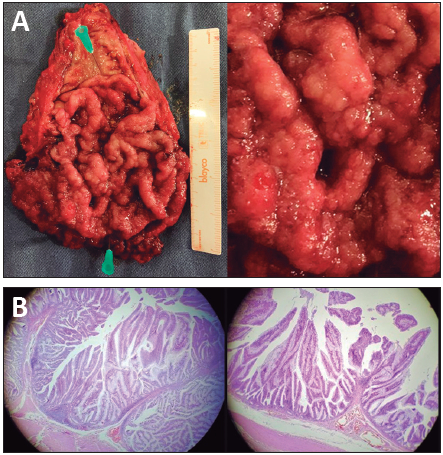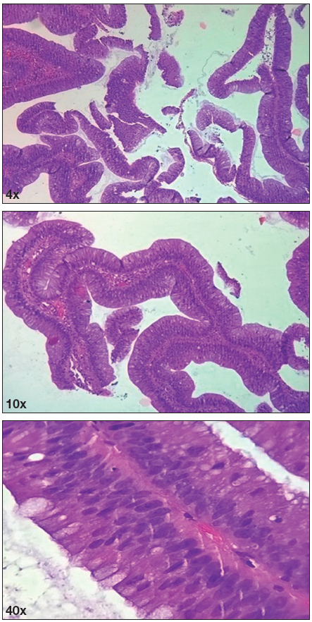 Procesos digitiformes constituidos por el tejido conectivo recubierto de las células epiteliales. Estas presentan displasia de bajo grado con pseudoestratificación del epitelio glandular, con núcleos elongados, hipercromáticos, localizados de forma predominante en la porción basal y escasa actividad mitótica.