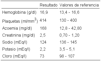 En el análisis bioquímico se constató una insuficiencia renal con un aumento de azoemia, creatininemia y filtrado glomerular de 25 ml/min / 1,73 m2; hiponatremia, hipokalemia severa e hipocloremia (Tabla 1).