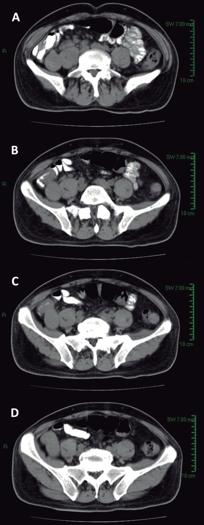 En el análisis de laboratorio al ingreso se constata anemia, con hemoglobina de 8 g/dL y hematocrito de 26%, caracterizada como ferropénica. El resto del laboratorio, normal. Se programa videocolonoscopía, que constata una tumoración tubular que empuja desde la submucosa hacia la luz del ciego en su cara posterior, asociada a sangrado a través del orificio del apéndice cecal (Figura 1). El resto del examen videoendoscópico fue normal.