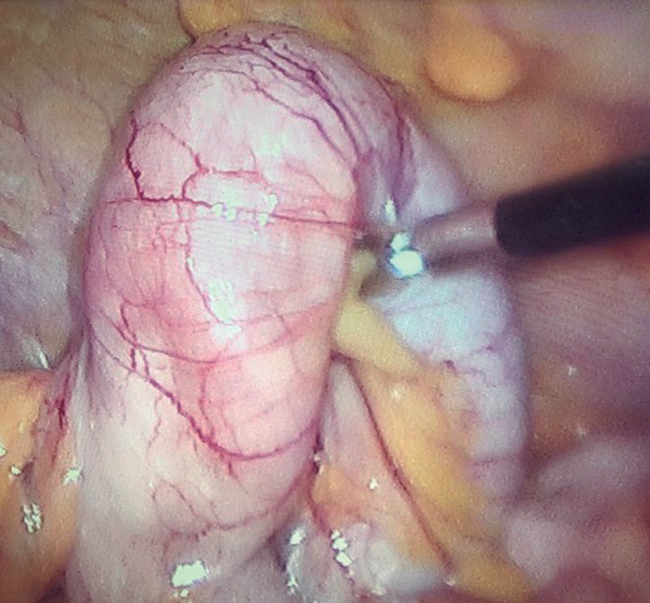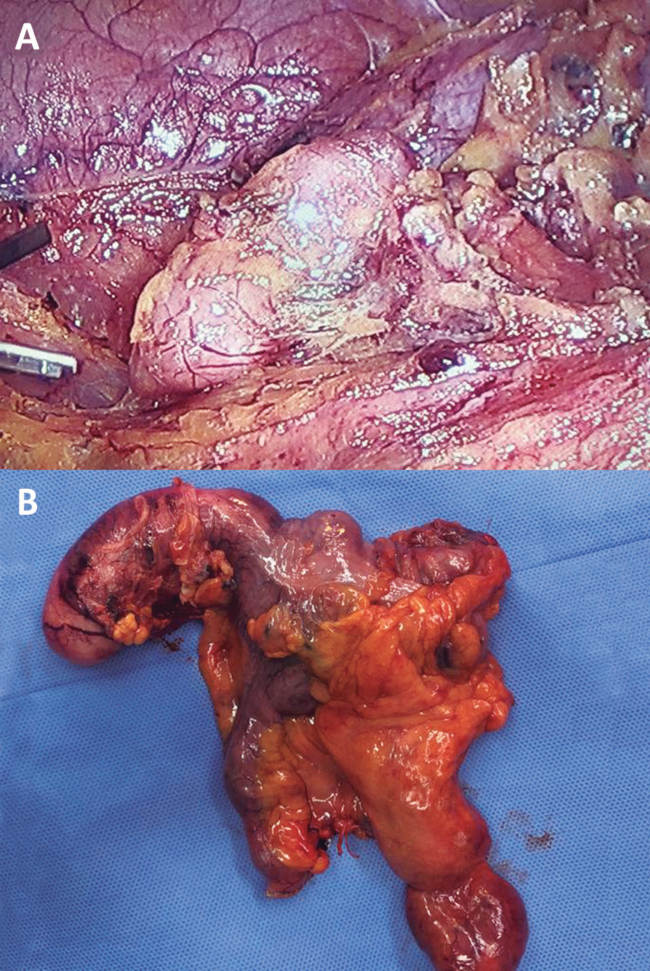Se decide conducta quirúrgica. Se realiza laparoscopía exploradora que confirma la sospecha de tumor apendicular localizado, sin ascitis ni implantes en peritoneo (Figura 3). Se realiza lavado y aspiración de la cavidad para citología oncológica. El tumor se encuentra en situación retro-cecal ascendente. Se realiza hemicolectomía derecha laparoscópica, con linfadenectomía del mesocolon derecho hasta el origen de la arteria cólica derecha. En el espesor del mesocolon derecho se objetivan adeno-megalias (Figura 4). Se exterioriza la pieza por una incisión mediana de 8 cm protegida con dispositivo Alexis® (Aplied Medical – EE. UU.). Se confecciona anastomosis latero-lateral con sutura manual.
