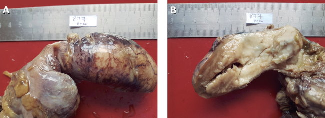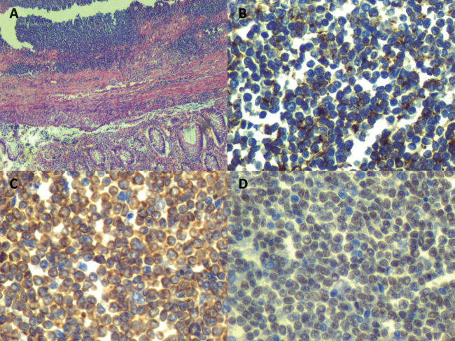 El informe de anatomía patológica muestra en la macroscopía un tumor sólido que ocupa completamente la luz apendicular y conserva el contorno vermiforme del órgano (Figura 5), de 9 cm de largo por 3 cm de diámetro mayor. Se disecaron adenomegalias en el meso del colon, la mayor de 3 cm de diámetro, contándose dieciséis ganglios en total. Los cortes histológicos del apéndice cecal muestran mucosa conservada, y subyacente a esta se observa una proliferación linfoide de elementos pequeños y medianos clivados (centrocitos) con escasas células grandes (centroblastos), con tendencia a delimitar folículo. En nueve de los dieciséis ganglios disecados se encuentran cambios histológicos de similares características. Las técnicas de inmunohistoquímica muestran positividad de marcadores CD20, PAX5, BCL2. Ki67 de 7% con distribución dispersa. Hallazgos compatibles con linfoma no Hodgkin tipo B, sugestivo de linfoma folicular grado 2 (Figura 6). Como parte de la estadificación definitiva del linfoma se realizó una nueva tomografía computada multicorte corporal total que descartó otras posibles localizaciones del linfoma. Se realizó además una biopsia de medula ósea por punción aspiración, que informó ausencia de infiltración medular por linfoma.