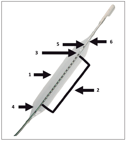 El catéter del EndoFLIP en su extremo distal tiene: 1) un balón, dentro del cual encontramos varios componentes; 2) anillos de impedancia; 3 y 4) electrodos de corriente; 5) sensor de la presión de estado sólido; 6) puerto de infusión.