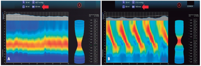 En esta figura se observan las imágenes que se pueden obtener con los diferentes catéteres del EndoFLIP. Marcado con la letra A se puede observar la imagen de un estudio del EndoFLIP con un balón de 8 cm. Esta nos permite evaluar la distensibilidad de la UEG. Marcado con la letra B se puede observar la imagen obtenida con un balón de 16 cm. Esta sonda nos permite evaluar la distensibilidad de la UEG además de la respuesta contráctil del cuerpo del esófago inducida por la distensión (peristalsis secundaria). Marcado con flechas rojas se observa la medida del balón del EndoFLIP.