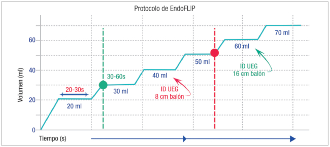 Modificado de Savarino et al.2 donde se muestra el protocolo del EndoFLIP. En las abscisas se grafica el tiempo, en las ordenadas el volumen. El volumen se expresa en mililitros (ml), el tiempo en segundos (s). Se muestra el volumen al cual se debe valorar el índice de la distensibilidad y la unión esofagogástrica (ID UEG): para el balón de 8 cm, 40 ml, y para el balón de 16 cm, 60 ml.