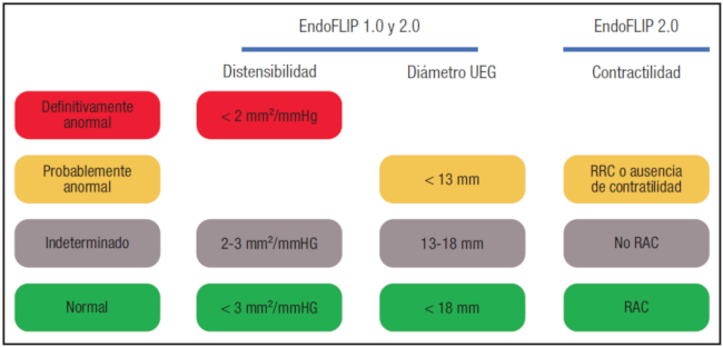 En el consenso recientemente publicado por Savarino et al.2 se describe el ID de la UEG como normal entre 3,0 - 9,0 mm2/mmHg, indeterminado de 2,1 - 3 mm2/ mmHg y anormal < 2 mm2/mmHg (Figura 5).12 Para el modelo de 16 cm últimamente se ha publicado un valor normal del ID de la UEG como > 2,8 mm2/Hg, basado en las mediciones en sujetos controles asintomáticos bajo sedación consciente.13