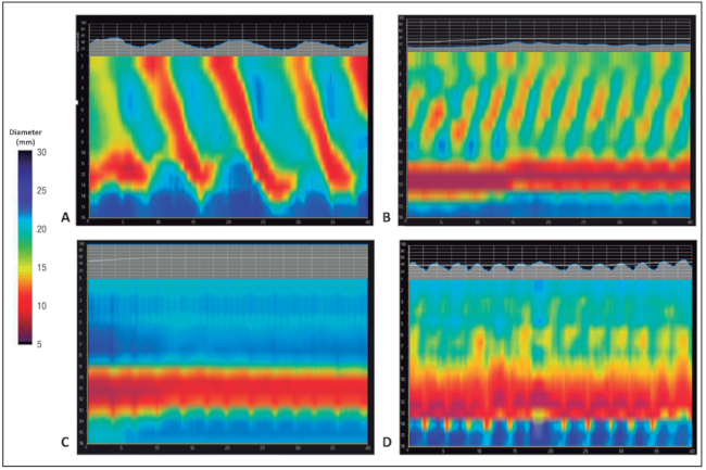 Además de la dirección y la frecuencia, las contracciones se clasifican en oclusivas, cuando las contracciones alcanzan un diámetro luminal menor de 6 mm, y no oclusivas, con un diámetro mínimo luminal mayor a 6 mm.14 Respecto a la contractilidad del cuerpo del esófago, las RAC son consideradas como la respuesta normal durante un estudio de EndoFLIP, basado en el estudio de Carlson que mostró las RAC con una frecuencia de 4 a 8 por minuto en 100% de los sujetos controles asintomáticos.15 Basado también en este estudio, se ha descrito la "regla de 6", la cual se refiere a la presencia de más de 6 RAC consecutivas, con duración mayor a 6 s, con longitud > 6 cm y con una frecuencia de 6 ± 3 contracciones por minuto. Es importante además notar que los sujetos controles asintomáticos nunca presentaron contracciones retrogradas.15 La contractilidad ausente representa una respuesta anormal en el esófago al igual que las contracciones retrogradas que se han asociado a espasmo esofágico, la acalasia y la obstrucción del tracto de salida de la UEG (Figura 5).2