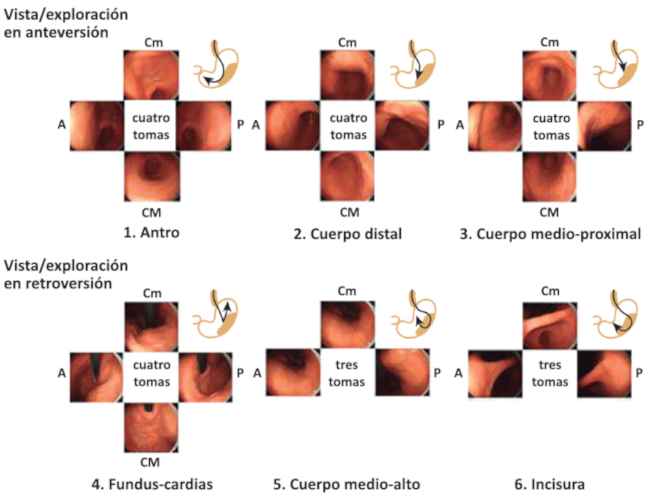 La definición de un procedimiento completo incluye la inspección del esófago, estómago y duodeno. En el caso de que no se haya realizado una VEDA en los 3 años previos, la duración de la exploración (desde la intubación hasta la extubación) debe ser de mínimo 7 minutos. Teh et al., demostraron que los endoscopistas lentos detectaban más lesiones premalignas gástricas (OR 2,5) y también más cáncer y lesiones con displasia (OR 3,42). Es recomendable incluir la visualización de la papila como criterio de exploración completa (de forma extrapolable a la intubación del ciego en la colonoscopia), ya que se asocia a una tasa más alta de detección de lesiones, probablemente porque refleja que se trata de una exploración más minuciosa. La realización de una VEDA completa incluye la fotodocumentación adecuada (de las áreas de referencia y de las lesiones). Cuando la indicación es por reflujo gastroesofágico y esófago de Barrett (EB), deberían realizarse fotografías de la impronta diafragmática y el borde superior de los pliegues gástricos. Una VEDA de calidad debería incluir al menos 10 fotografías: esófago proximal, esófago distal, impronta diafragmática/ línea Z, fundus y cardias en retroversión, cuerpo en visión frontal, cuerpo retroversión, incisura, antro, bulbo y segunda porción duodenal. En las endoscopías para seguimiento de pacientes con lesiones pre-neoplásicas gástricas se recomienda el protocolo de cribado sistemático (más conocido como SSS) que consiste en la obtención de 22 fotografías (Figura 1).