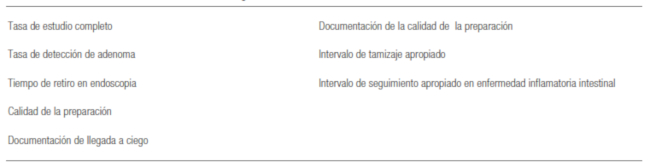 Los indicadores más importantes están señalados en la Tabla 1, el peso que tienen en la mejora de la calidad es variable y su implementación en forma independiente o conjunta siempre mejorarán los índices de detección de lesiones, pero estos indicadores requieren que el proceso de la endoscopia cumpla con los protocolos correctos en la realización del estudio.