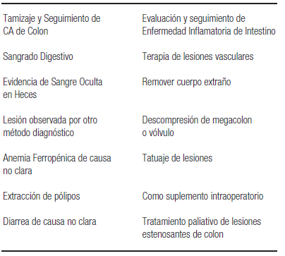 El desarrollo de la técnica endoscópica ha permitido generar múltiples indicaciones para la colonoscopía que se extienden desde su uso diagnóstico al terapéutico. Las indicaciones habituales se encuentran en la Tabla 4. El objetivo es minimizar las indicaciones inapropiadas. Cuando la indicación no es la habitual, esto debe ser documentado. Es necesario evitar un estudio cuando no es necesario ya que más allá de generar costos, los beneficios son usualmente bajos, exponiendo al paciente al riesgo del procedimiento.