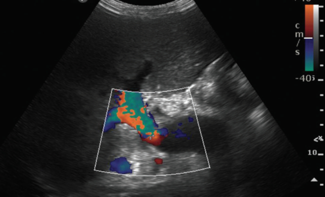 Ecografía hepática doppler color con un aumento de la velocidad de la vena porta de 200 cm/s.