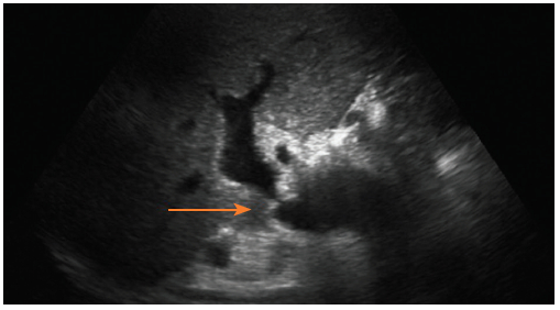 Ecografía hepática. Se observa una disminución abrupta (flecha naranja) del calibre de la luz de la vena porta al nivel del hilio hepático.