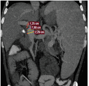 TCMD del abdomen. Se visualiza en la vena porta un estrechamiento de su luz a nivel del hilio hepático, presentando un diámetro de 6 mm, previo a esta de 20 mm y posterior (nivel hepático antes de su bifurcación) de 15 mm.