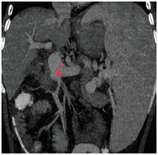 TCMD del abdomen. Se observa defecto de relleno (flecha roja) y aumento del calibre de la vena mesentérica superior.