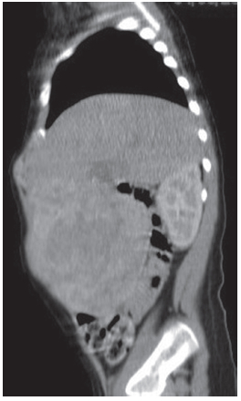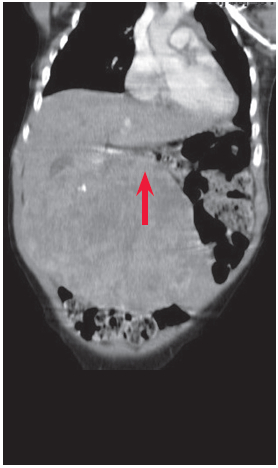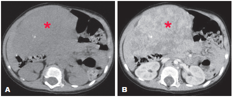 Paciente femenina de 24 meses de edad, sin antecedentes de importancia, acude a la guardia por presentar trauma cerrado de abdomen, con el hallazgo en el examen físico de hepatomegalia. Se documentan valores iniciales de alfafetoproteína (AFP) en 42457 UI/ml; HB: 9,8 g/dL; HTO: 30,3%; leucocitos: 10340 mm3; TGO: 53 UI/L; TGP: 11,1 UI/ml; LDH: 626 UH/ml; y fosfatasa alcalina: 110 UI/L. Se le realiza TCMD con contraste EV (Figuras 1, 2 y 3).