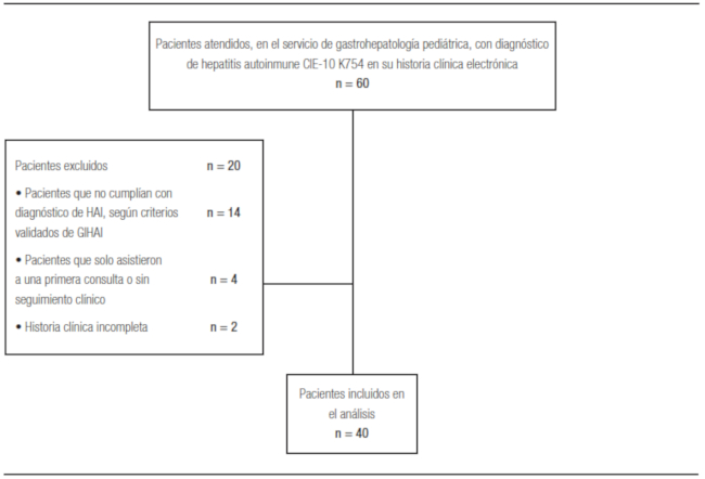 Entre el 1° de enero de 2011 y el 31 de diciembre de 2019, se atendieron sesenta pacientes con diagnóstico de hepatitis autoinmune. De ellos, veinte cumplían con los criterios de exclusión y se realizó el análisis a los cuarenta restantes. En la Figura 1, se describe el proceso de selección.