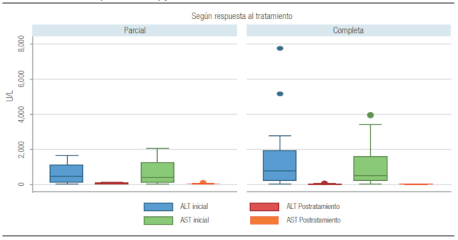 La mediana de alanino aminotransferasa (ALT) inicial fue de 551 U/L (RIC 10-1631), y postratamiento de 25 U/L (RIC 13-61). Para el aspartato aminotransferasa (AST), la mediana inicial fue de 502 U/L (RIC 210-1600) y postratamiento de 28 U/L (RIC 25-50), encontrando una mayor diferencia en los pacientes que presentaron remisión bioquímica en relación con los pacientes con remisión parcial. Estos resultados se encuentran en la Figura 2.