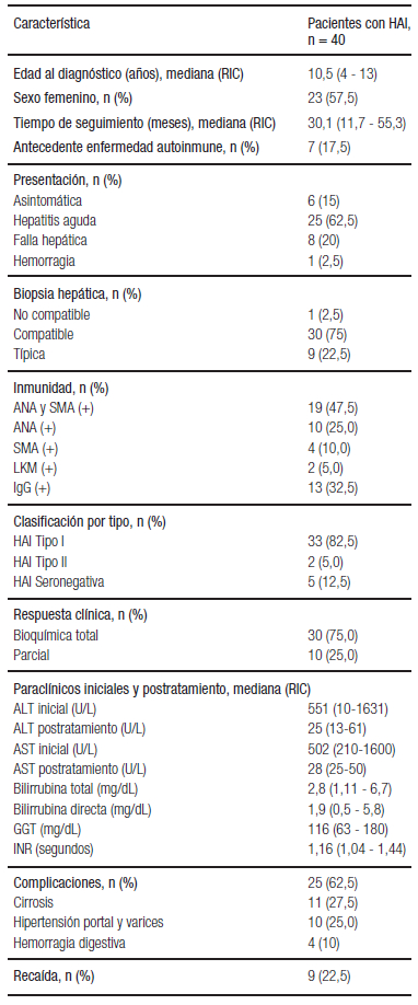 La HAI es una entidad poco frecuente en la edad pediátrica, pero no es despreciable en nuestro medio. Se encontró una mayor prevalencia de HAI tipo I, la mayoría de los pacientes debutó con sintomatología de hepatitis aguda y un mayor porcentaje de la población era de sexo femenino. Se evidenció que las características y la respuesta clínica manifestadas, en esta cohorte de pacientes, son similares a las descritas en las distintas series en la población a nivel mundial.