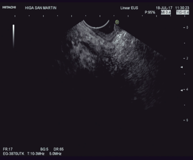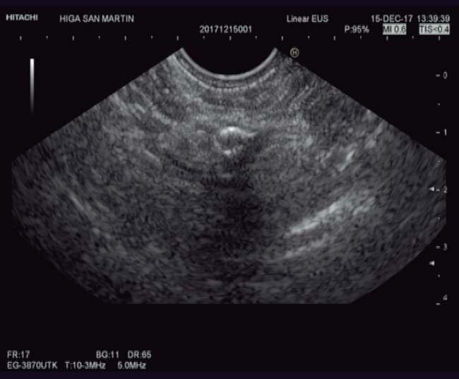 La ultrasonografía endoscópica (USE) es en la actualidad el método de elección para la detección de cambios morfológicos tempranos relacionados a PC, debido a su capacidad para detectar cambios menores parenquimatosos y ductales, que no pueden ser detectados por otros métodos de imágenes, y su especificidad aumenta con el aumento de los criterios diagnósticos.4 Para el diagnóstico por USE de PC, los criterios de Rosemont modificados son los más utilizados. La clasificación de Rosemont se compone de criterios mayores y menores bien definidos y cuatro grupos de diagnóstico. Los grupos de diagnóstico incluyen: consistentes, sugestivos, indeterminados y normal. La PC consistente incluye 2 criterios mayores A; o 1 mayor A + 1 mayor B; o 1 mayor A + 3 criterios menores. La PC sugestiva incluye 1 criterio mayor A + < de 3 criterios menores; o 1 criterio mayor B + 3 criterios menores; o 5 criterios menores. La PC indeterminada comprende 1 criterio mayor B + < de 3 criterios menores; o 3 o 4 criterios menores.5