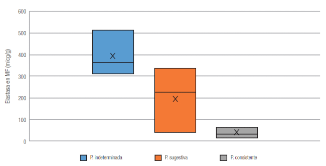Los valores de elastasa fecal son menores en los pacientes con PC consistente, en comparación con los pacientes con PC indeterminada.