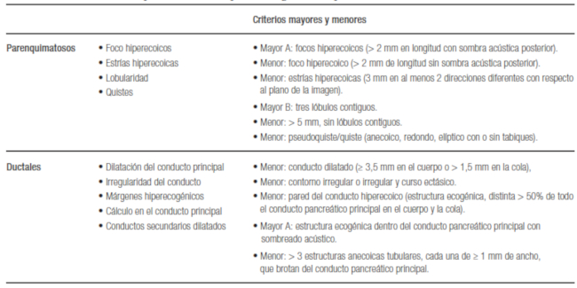 Los criterios mayores A incluyen focos hiperecoicos (con sombra acústica posterior), y cálculos del conducto mayor (estructura ecogénica). El criterio mayor B es la lobularidad (≥ 3 lóbulos contiguos: "panalización"). Los criterios ductales menores incluyen: quiste, conducto dilatado, contorno irregular del conducto, rama lateral dilatada y pared del conducto hiperecoico. Los criterios parenquimatosos menores incluyen estrías hiperecoicas, focos hiperecoicos y lobularidad5 (Tabla 1).