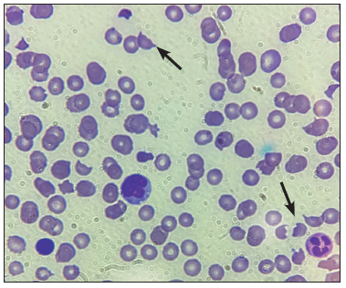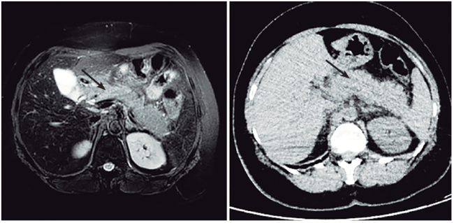 A 47-year-old female patient was admitted to the emergency service of our hospital with the complaints of abdominal distension, dyspepsia, and bilious vomiting. The patient had a history of coronary artery disease, hypertension and coronary angiography 15 days ago. The patient was receiving metoprolol and clopidogrel regularly. She had abdominal pain in the epigastric region and vomiting. She also complained of dark urine color. On physical examination, her general condition was moderate; she was conscious, oriented-cooperative, and there was tenderness in the abdomen. There was no defense, no rebound. Petechiae, purpura and ecchymosis were not observed in the inspection performed to detect bleeding disorder. Laboratory analyses were as follows: white blood cell count = 9.200/µL; absolute neutrophil count = 5830/µL; hemoglobin = 8.4 g/dL; platelets = 6000 /µL; urea = 96 mg/dL; creatinine = 1.35 mg/dL; lactate dehydrogenase > 750 U/L; Amylase = 262 U/L; Lipase = 427 U/L; T. Bilirubin = 1.9 mg/dL; D. Bilirubin = 0.6 mg/dL; I. Bilirubin = 1.3 mg/dL; procalcitonin = 0.1 µg/L; C-reactive protein = 62.5 mg/L; ferritin = 857 µg/L; folate = 22 ng/mL; vitamin B12 = 225 ng/L; reticulocyte = 4.31%; corrected reticulocyte count = 2.4. ADAMTS-13 activity was found to be low. It was considered that this patient with high lactate dehydrogenase, indirect hyperbilirubinemia, anemia, and thrombocytopenia may have hemolytic anemia and microangiopathic hemolytic anemia. Therefore, a peripheral smear was performed in which, schistocytes were seen in all areas (Figure 1). The platelet count was found to be ten thousand accordingly. No atypical cells were detected. Abdominal CT was performed to the patient with the prediagnosis of acute pancreatitis. In the abdominal CT of the patient, an increase in pancreatic dimensions in all axes and contamination of the mesenteric fatty tissue in the peripancreatic area were detected (Figure 2). This patient, who met all three of the acute pancreatitis diagnostic criteria (abdominal pain, amylase or lipase elevation and characteristic findings in the taken images) was diagnosed with acute pancreatitis and TTP (secondary to acute pancreatitis). Plasmapheresis treatment with fresh frozen plasma, pain control, and IV fluid treatment was initiated for the patient. She received 5 sessions of plasmapheresis treatment. Hemodialysis was not required in the follow-up of this patient who had high urea and creatinine on admission. The patient's kidney function tests returned to their baseline level. During her follow-up, the platelet value increased to 140,000 /µL. Abdominal pain recovered, amylase and lipase levels decreased to normal levels.
