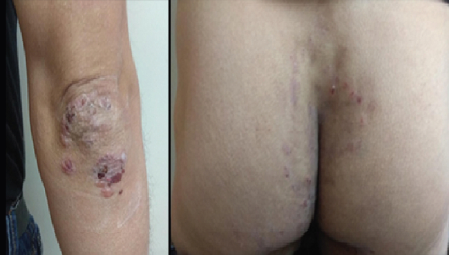 Hombre de 49 años, tabaquista de larga data, hermano con diagnóstico de EC, sin otros antecedentes médicos a destacar. Se realizó el diagnóstico de DH cuatro meses antes de la consulta gastroenterológica, por la presencia de máculas hiperpigmentadas, erosiones con costra hemática, microvesículas y pápulas eritematosas, pruriginosas, a nivel de codos, región sacra y pliegues interglúteos (Figura 1). El diagnóstico fue confirmado por biopsia lesional y perilesional con inmunofluorescencia directa (Figura 2) y se inició DLG desde esa fecha. Se encontraba asintomático en lo digestivo, sin repercusión general ni otras manifestaciones extraintestinales evidentes. El examen físico fue normal. No presentaba lesiones en la piel, al momento de la evaluación.