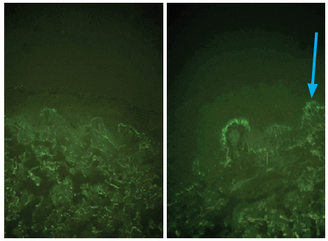 En el caso expuesto, las biopsias cutáneas perilesionales fueron fundamentales para confirmar el diagnóstico. En general, evidencian microabscesos neutrofílicos en las papilas dérmicas y grados variables de infiltrado inflamatorio en la dermis superficial. Esto no es específico y puede encontrarse en otras enfermedades cutáneas autoinmunes. El método ideal para el diagnóstico de esta entidad es el hallazgo de depósitos de IgA granular en la unión dermoepidérmica, en biopsias de la piel perilesional, el cual es considerado un hallazgo patognomónico.8