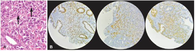 Se realizó estudio inmunohistoquímico que evidenció el siguiente perfil: CK 7 positiva heterogénea, CK 20 positiva heterogénea, CDX2 positiva intensa difusa, CEA positiva intensa difusa, CA 19-9 positiva heterogénea, cromogranina A y sinaptofisina negativas. Con este resultado, se concluyó que la mucosa duodenal se encontraba infiltrada por un carcinoma pobremente diferenciado, con células en anillo de sello con perfil inmunohistoquímico sugestivo de origen gastrointestinal alto gástrico, duodenal, ampular y más alejado biliopancreático (Figuras 4 A y B).