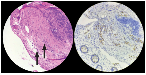 Al año del diagnóstico, se detectó, en la videocolonoscopía, un sector en colon derecho de mucosa de aspecto inflamatorio con edema, eritema y friabilidad, que no presentaba el aspecto de lesión vegetante y voluminosa, como en los casos de un neoplasma primario de colon derecho. En la histología, se evidenció, en un fragmento focalmente a nivel muscular de la mucosa y submucosa, regueros de células en anillo de sello, con un perfil de inmunohistoquímica positivo para CKAE1/AE3 y CK20, con CK7 no concluyente.
