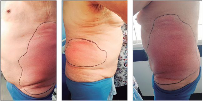 En el cuarto día de hospitalización, el paciente presentó la reaparición del dolor abdominal asociado a signos inflamatorios locales dados por un eritema bien delimitado a nivel de los flancos (Figura 1).