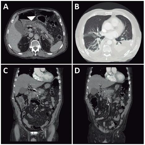 El paciente de 84 años, hipertenso en tratamiento con losartán y con dislipidemia mixta (hipercolesterolemia e hipertrigliceridemia) sin manejo farmacológico, acudió al servicio de urgencias por un dolor de tres días en el epigastrio y en el hipocondrio derecho, irradiado a la región dorsal, asociado a náuseas y episodios eméticos. En el momento del ingreso, está álgico, taquicárdico, afebril, sin desaturación ni taquipnea. En el examen físico, está con ictericia en las escleras, dolor en la palpación en el hipocondrio derecho y sin signos de irritación peritoneal. Los paraclínicos del ingreso se presentan sin leucocitosis ni neutrofilia, el perfil hepático está alterado con un patrón colestásico y hay una elevación de la amilasa e hiperlactatemia (Tabla 1).