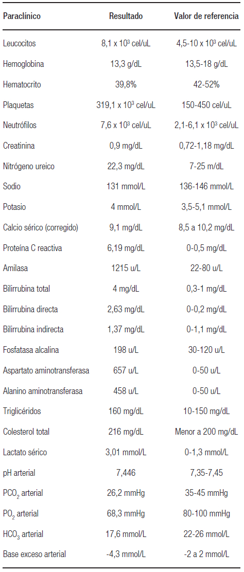Se la consideró como una pancreatitis aguda de origen biliar por los criterios clínicos, serológicos e imagenológicos, moderadamente severa por la clasificación de Atlanta. Se descartó la causa farmacológica, asociada a una hipertrigliceridemia, una hipercalcemia o por el consumo crónico de alcohol. Se inició el tratamiento con líquidos endovenosos isotónicos a 5 ml/kg/h, durante las primeras 24 horas, junto con el manejo analgésico. Los paraclínicos de control mostraron un descenso de las bilirrubinas y adecuada depuración del lactato, por lo que se planteó la posibilidad de un cálculo biliar transitado. Presentó glucometrías fuera de rango, con HbA1c de 12%, por lo cual se inició el manejo con insulinas en el contexto de diabetes mellitus de novo. Se reinició el tratamiento vía oral dentro de las primeras 24 horas sin complicaciones.
