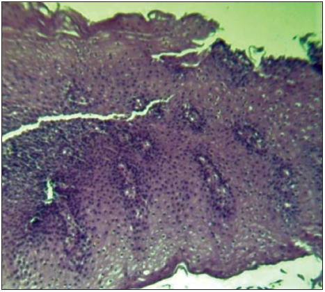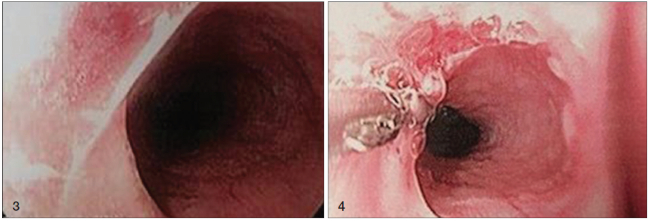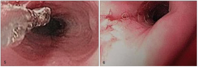 Ante este cuadro, se realizó una videoendoscopía digestiva alta. Al introducir el endoscopio bajo visión directa, se evidenciaron dos membranas que asentaban sobre la mucosa y provocaban estenosis de la luz en la región cricofaríngea (Figuras 3 y 4). Se produjo una disrupción de dichas membranas con el paso del endoscopio y se tomaron biopsias (Figuras 5 y 6). En el estudio histológico de estos fragmentos, se observó epitelio escamoso esofágico engrosado, sin atipias (Figura 7). El resto del esófago mostró mucosa de aspecto normal y en el estómago, no se identificaron lesiones mucosas.